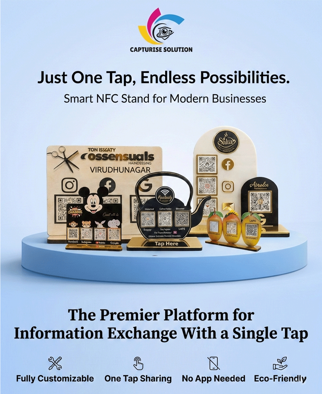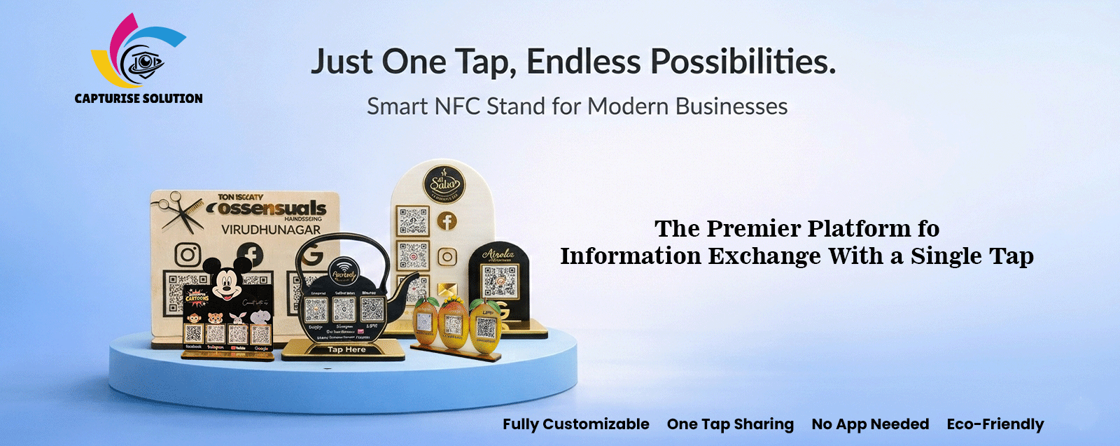 Capturise Solution helps businesses upgrade their identity with innovative NFC and QR-based digital tools. Our smart Digital Business Cards and Smart Standees allow instant sharing of contact details, social media profiles, websites, and payment links with a simple tap or scan. We make networking faster, smarter, and more professional.